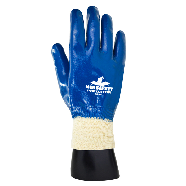Guante recubierto de nitrilo para abrasión y químicos, marca MCR, modelo 9751. Guante con acabado liso, completamente recubierto con espesor grueso y jersey de algodón, con puño tipo calcetín. Tratado con Actifresh para eliminar bacterias y promover frescura. Excelente resistencia a la abrasión. Resistente a aceites, grasas y solventes. Ideal para procesos químicos.